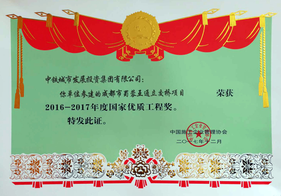 中鐵城投集團工程總承包管理、中鐵一局四公司施工的成都天府新區蜀蓉立交橋工程項目榮獲2016至2017年度國家優質工程獎。