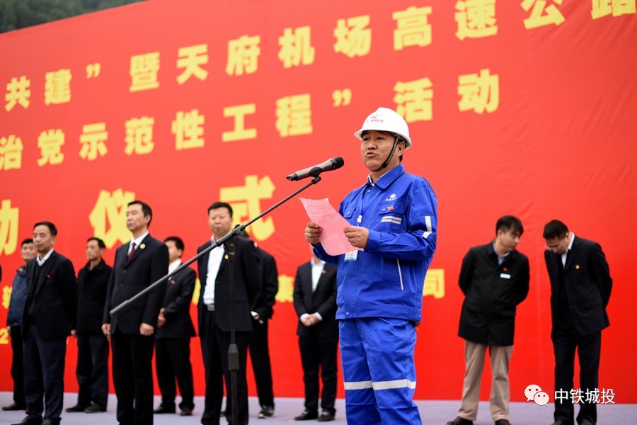天府機場高速公路項目工程指揮部指揮長、黨工委副書記趙愛軍代表指揮部全體黨員干部作表態(tài)發(fā)言。
